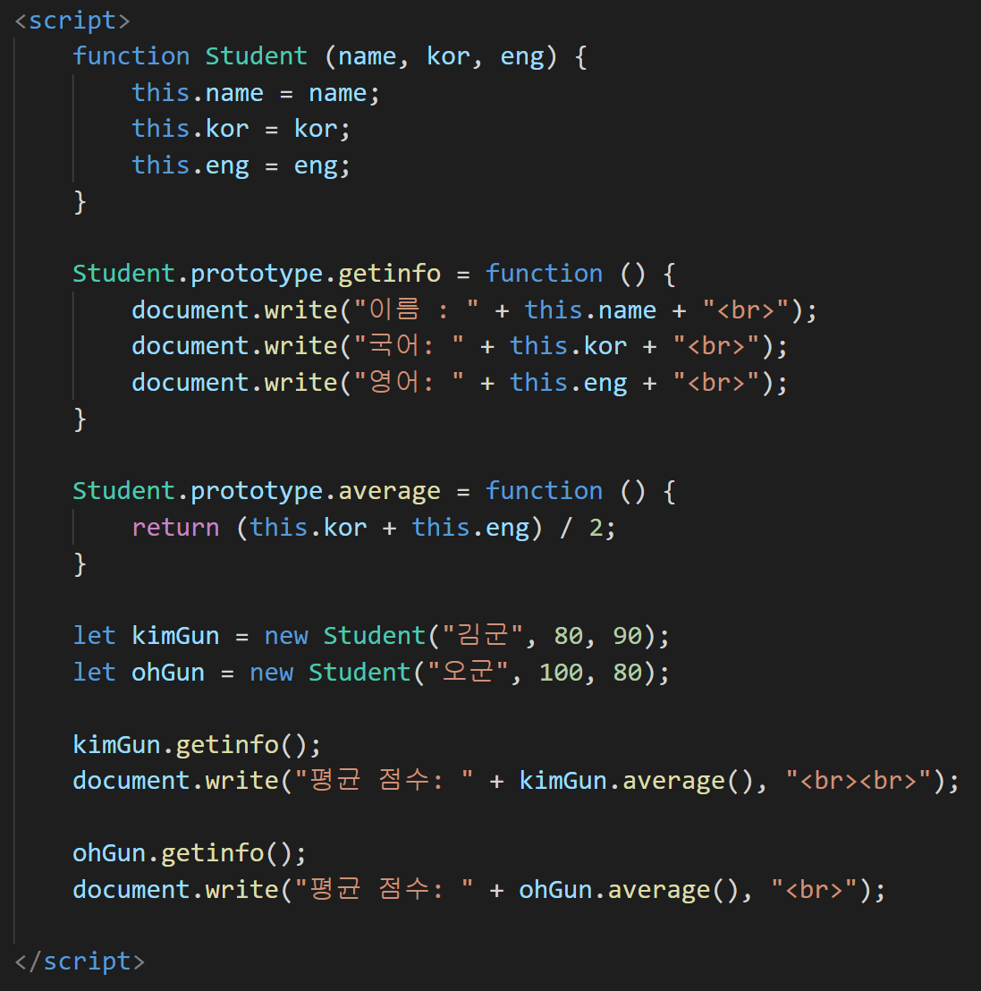 객체 생성 함수에는 속성과 기능이 들어간다고 했다. 아래 코드를 무시하고 객체 생성 함수(여기서는 Student)에 속성과 기능(getinfo, average)를 다 넣었다고 해보자. 그럼 김군과 오군이라는 객체를 만들 때 해당 기능(getinfo, average)는 김군의 메모리에 하나, 오군의 메모리의 하나씩 저장이 된다. 생각해보자. getinfo와 average가 하는 기능은 김군이나 오군이나 같다. 굳이 두 개의 메모리에 각각 저장될 필요가 있을까? 메모리 입장에서 보자면 낭비인 것 같은 생각이 든다. 그래서 이걸 공통으로 묶어주는 것이다. 이미 메모리에 getinfo와 average를 저장해서 그걸 가져다 쓰기만 하면 되게끔 말이다.